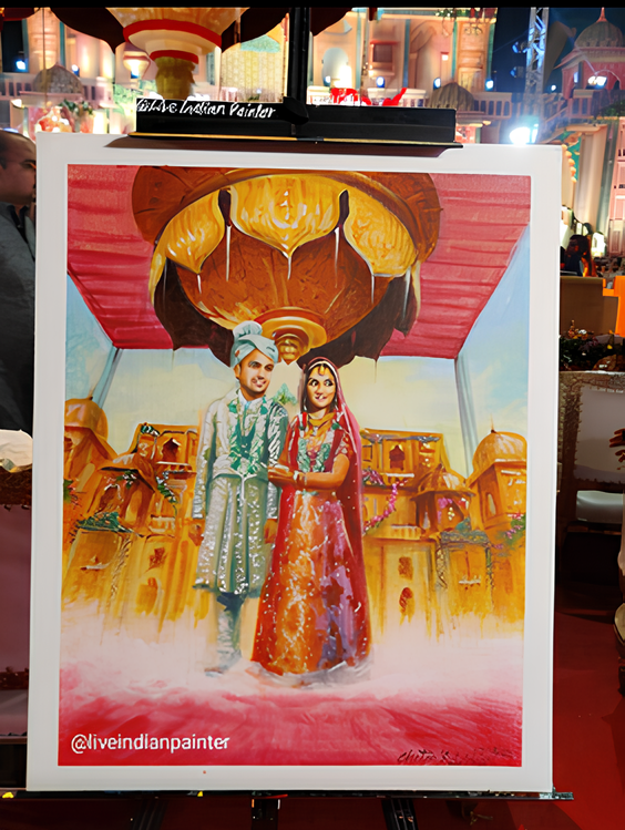 "Live Indian Painters are absolutely amazing and so talented! The painting was a surprise for my sister and brother-in-law at their wedding and they were so awestruck! Not only them, but the guests were amazed as well and throughout the afternoon and evening followed the progress and they all loved the finished painting! Definitely highly recommended!" -